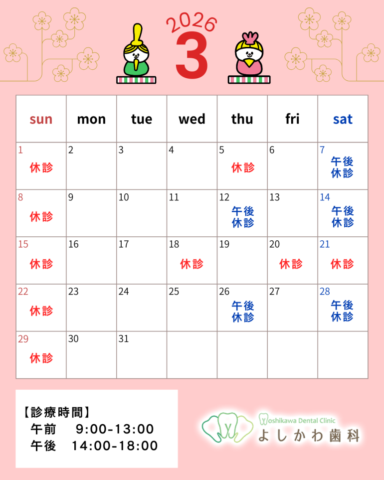 いつも当院をご利用いただきありがとうございます。 3月の休診日は下記カレンダーの通りとなります。